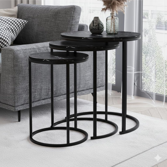 Tables d’appoint gigognes Lyon – Lot de 3 – Marbre noir – Métal noir