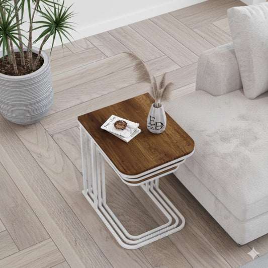 Tables d’appoint gigognes Lyon – Lot de 3 – Bois foncé – Structure métal blanc