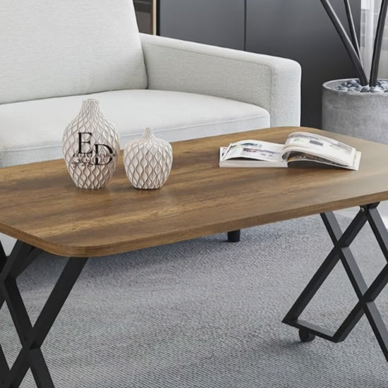 Table basse MILANO – Plateau bois foncé – Piètement X métal noir – Roulettes ou bouchons