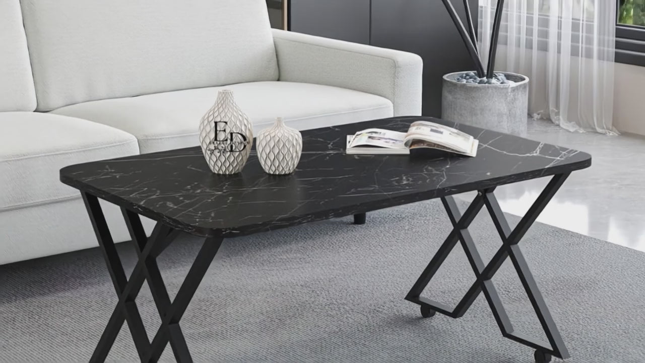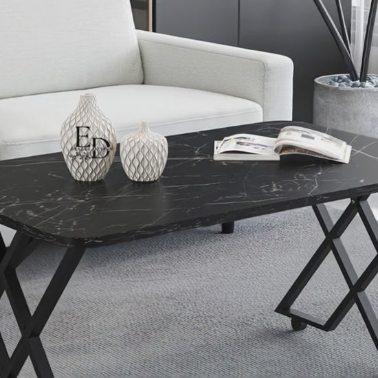 Table basse MILANO – Plateau marbre noir – Piètement X métal noir – Roulettes ou bouchons