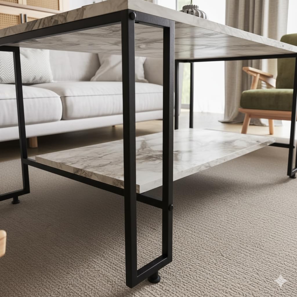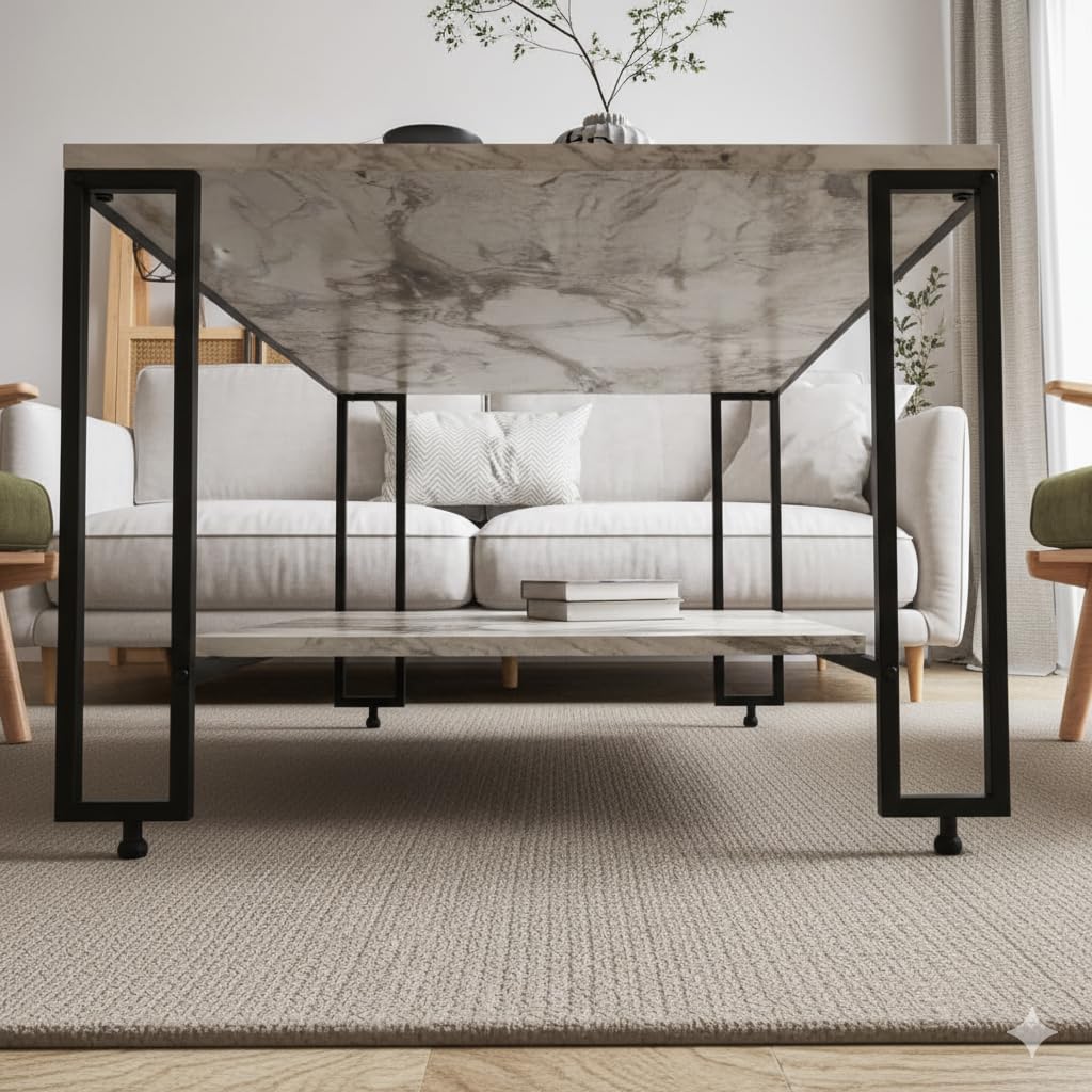 Table basse rectangulaire Nury avec étagère, plateau marbre blanc, structure métal noir