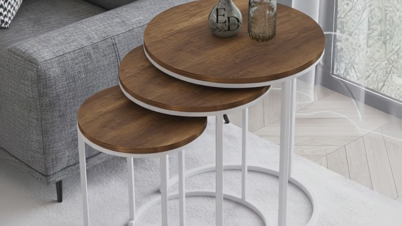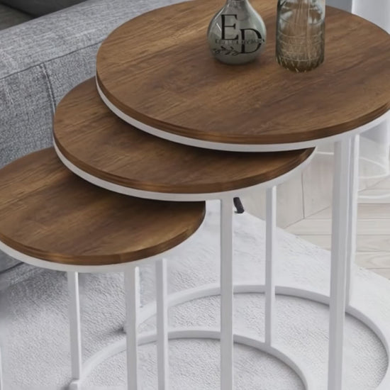 Tables d’appoint gigognes rondes Paris lot de 3 bois foncé structure métal blanc