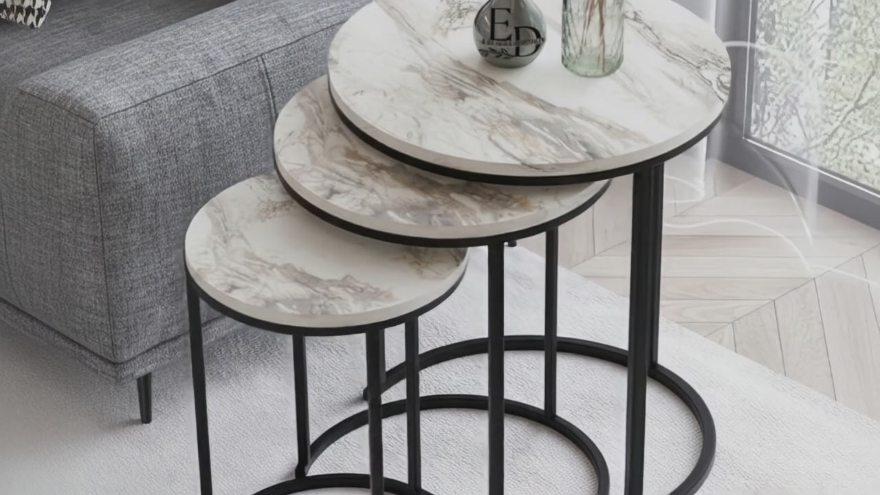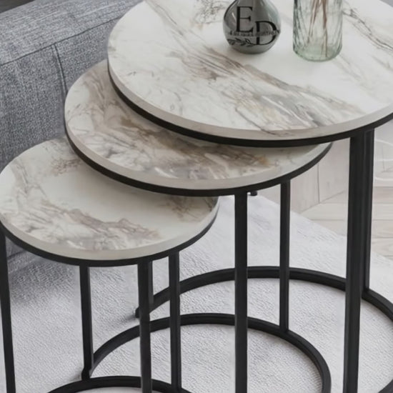 Tables d’appoint gigognes rondes Paris lot de 3 marbre blanc structure métal noir